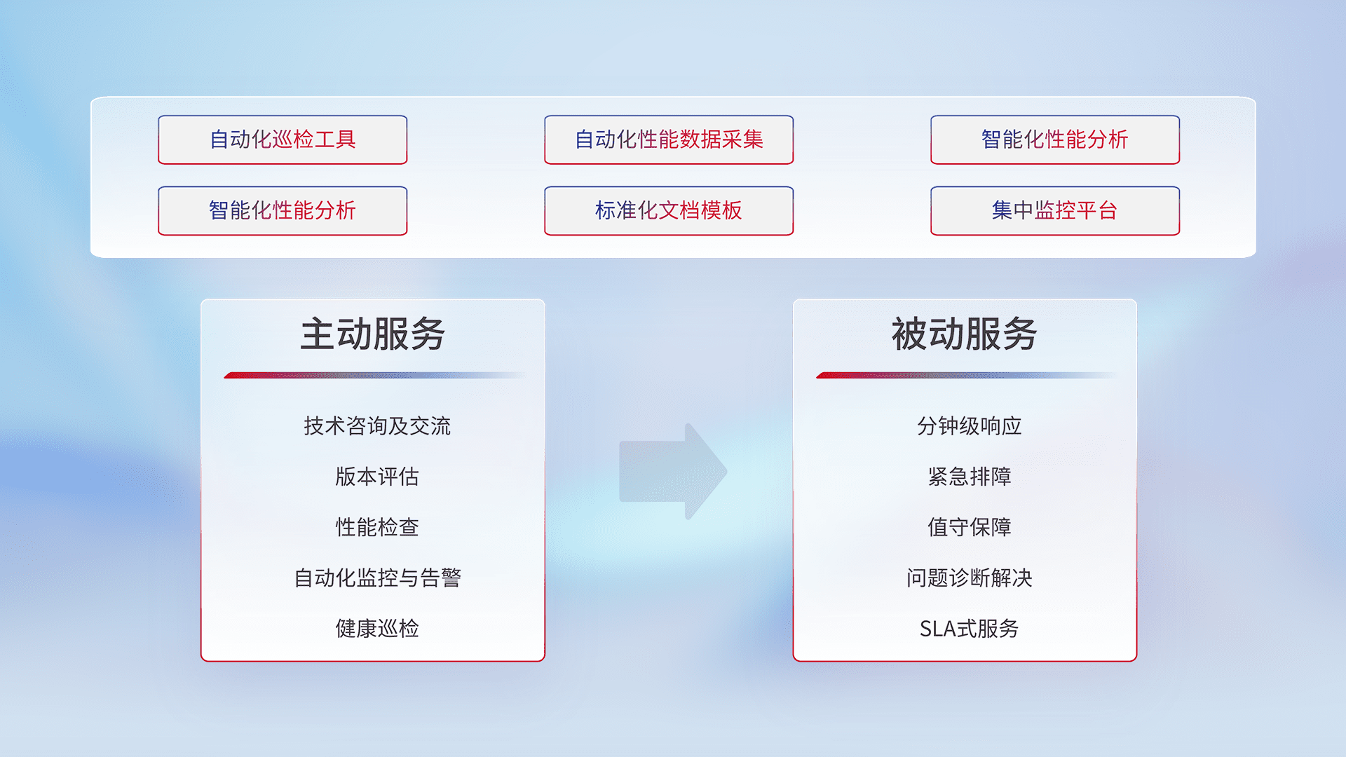 智能化工具和标准化文档,,,,保障服务质量,,提供主动服务(包含技术咨询、、、版本评估、、性能检查、、、自动化监控与告警、、健康巡检)和被动服务包含(分钟级响应、、、紧急排障、、、、值守保障、、、、问题诊断解决、、、SLA服务)。。